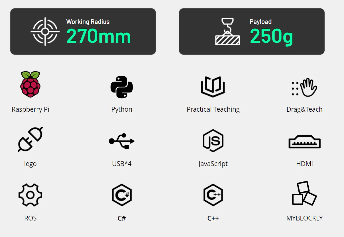 El mechArm 270-Pi es un brazo robótico articulado de 6 ejes diseñado por Elephant Robotics. Se destaca por ser uno de los brazos más compactos y ligeros del mercado con una estructura de tipo industrial, lo que lo hace ideal para educación, investigación y prototipado rápido.